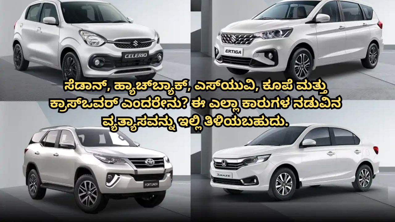 ಸೆಡಾನ್, ಹ್ಯಾಚ್ಬ್ಯಾಕ್, ಎಸ್ಯುವಿ, ಕೂಪೆ ಮತ್ತು ಕ್ರಾಸ್ಒವರ್ ಎಂದರೇನು? ಈ ಎಲ್ಲಾ ಕಾರುಗಳ ನಡುವಿನ ವ್ಯತ್ಯಾಸವನ್ನು ಇಲ್ಲಿ ತಿಳಿಯಬಹುದು.